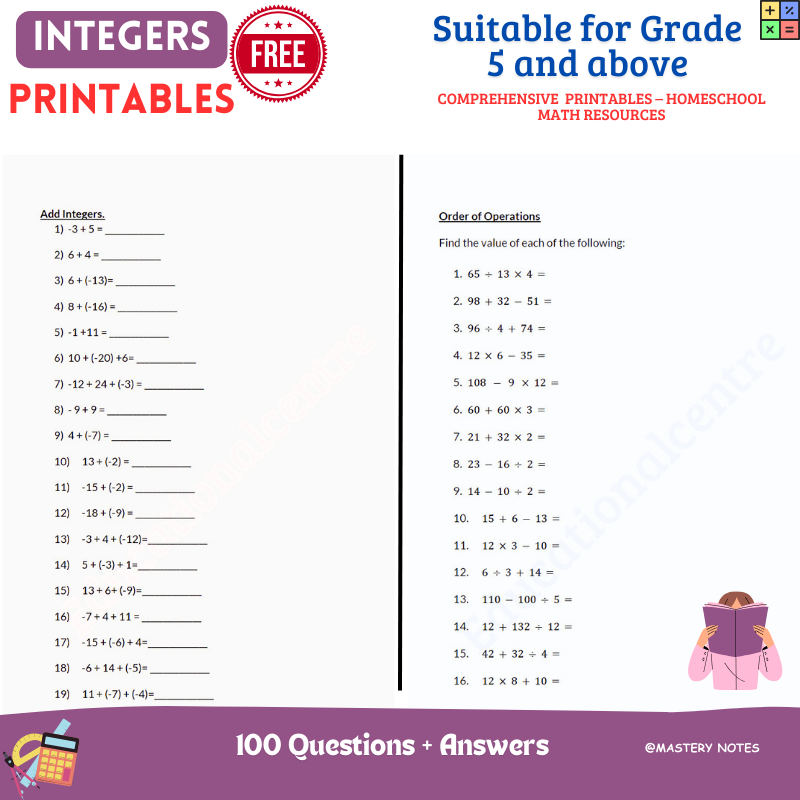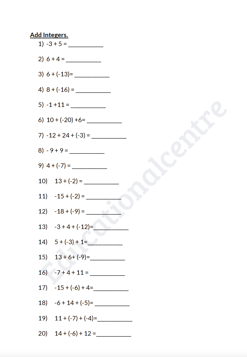 Integers Worksheet- Instant Download Printables